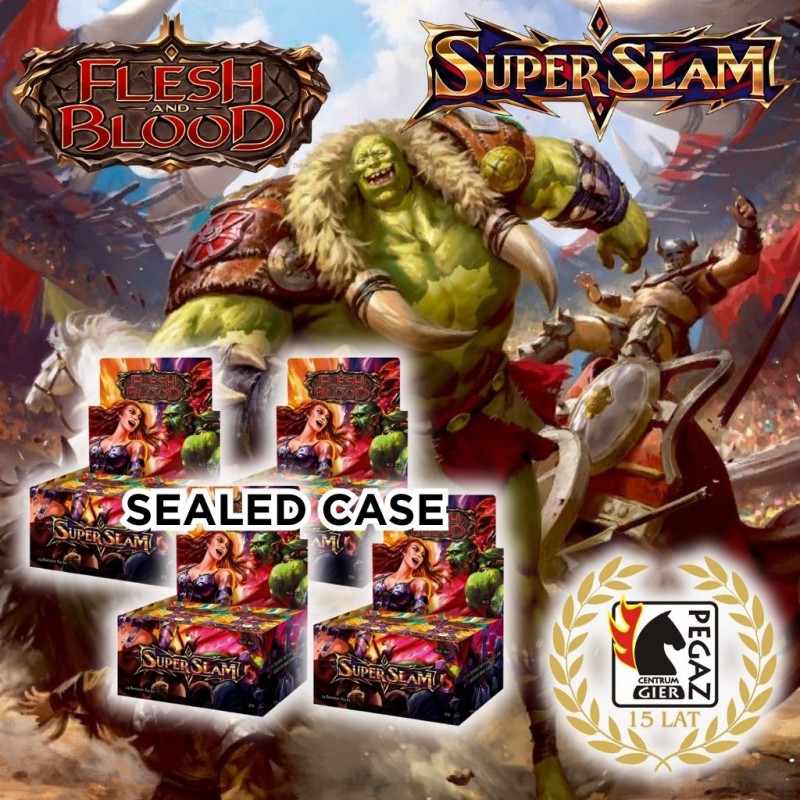 Booster case sealed zawierający 4 booster boxy zawierajace każdy 24 zestawy dodatkowe (boostery) z dodatku Super Slam gry karcianej Flesh and Blood TCG