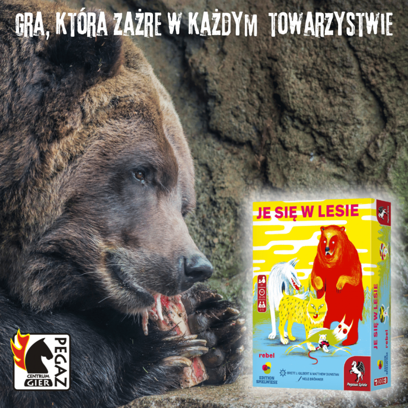 Je się w lesie to prosta gra karciana, w której starasz się skutecznie zapolować, a przy tym samemu nie stać się zwierzyną. Do dyspozycji masz zestaw zwierzaków: misia, wilka, rysia, sowę oraz mysz. Zgodnie z regułami rządzącymi przyrodą, duże drapieżniki polują na mniejsze zwierzęta, te są jednak zwinne i z łatwością mogą się wymknąć. Wykorzystaj swój instynkt, aby przechytrzyć innych graczy i przewidzieć, kogo tym razem wyślą na łowy. Jako pierwszy zbierz 5 znaczników i zostań królem lasu!