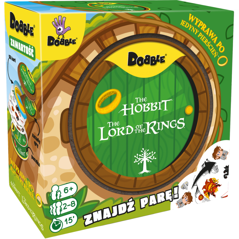 Zabierz Froda, Sama, Gandalfa oraz Smauga gdzie tylko zechcesz i baw się, szukając par w popularnej grze towarzyskiej! Spójrz na pierwszą kartę, którą trzymasz w ręku oraz na tę, która leży na środku stołu. Znajdź na nich wspólny symbol, nazwij go i szybko pozbądź się swojej karty. Teraz następna! Tylko nie zwątp, dwie karty zawsze łączy dokładnie jeden wspólny obrazek!