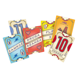 Karty modyfikatorów wpadają do Twojego rzędu i na koniec tury dodają +10 do wyniku, o ile nie odpadniesz, a mnożnik ×2 podwaja cały Twój wynik, zamieniając ostrożne dobijanie w prawdziwy jackpot. Karty akcji to prawdziwe petardy: „Flip 3” zmusza innego gracza do dobrania trzech kart naraz, „Zamroź” kończy czyjąś turę natychmiast (ale pozwala zachować punkty), a „Druga szansa” ratuje Cię w ostatniej chwili – gdy masz dublet, odrzucasz jedną kartę i odkrywasz nową.