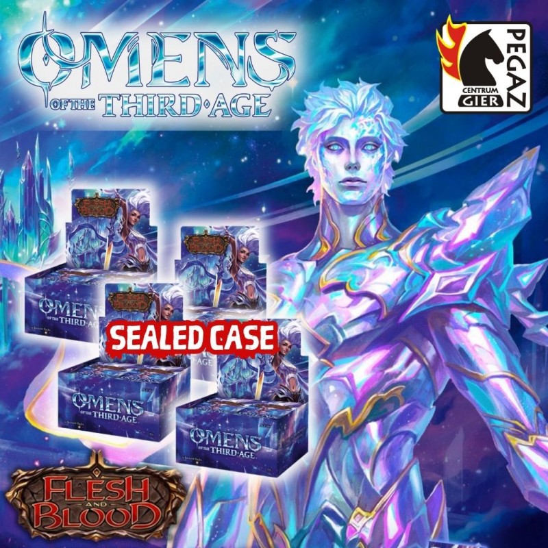 Booster case zawierający 4x booster box, każdy z nich zawierający 24 zestawy dodatkowe (boostery) z dodatku Omens of the Third Age gry karcianej Flesh and Blood TCG
